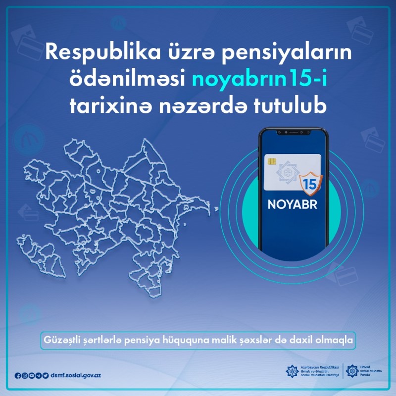 Respublika üzrə pensiyaların ödənilməsi noyabr ayının 15-i tarixinə nəzərdə tutulub. Həmin gün güzəştli şərtlərlə pensiya hüququna malik şəxslərin də pensiyası ödəniləcək.