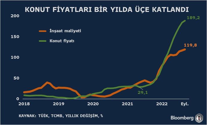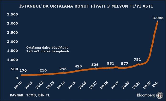 İstanbulda mənzilin orta hesabla qiyməti 3 milyon türk lirəsini (TL) keçib. Bir kvadrat metr üzrə orta qiymət 25 min 714 türk lisərinə yüksəlib. Bir kvadrat metr üzrə orta qiymət Ankarada 11 min 323 TL-yə, İzmirdə isə 18 min 761 TL-yə çatıb.