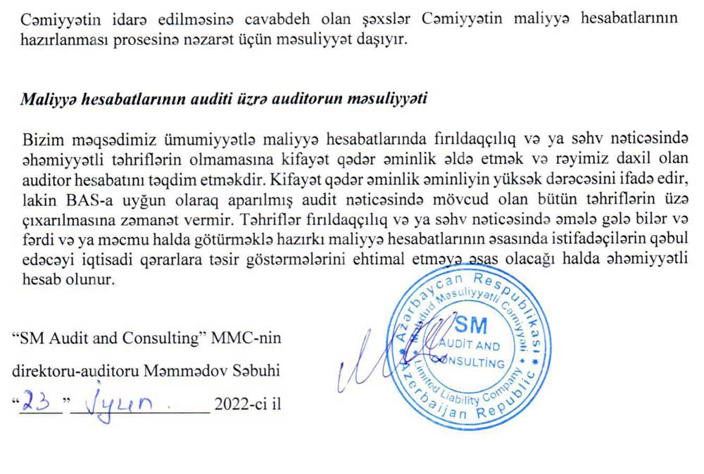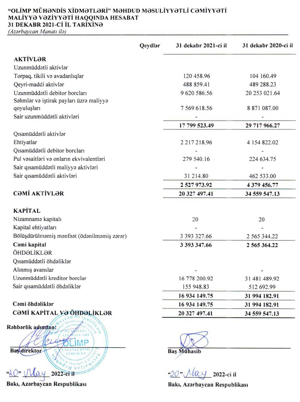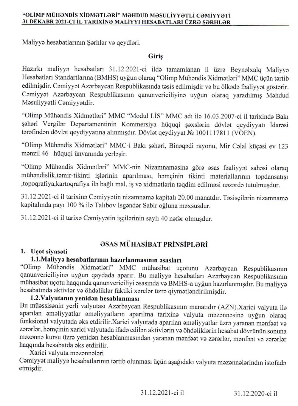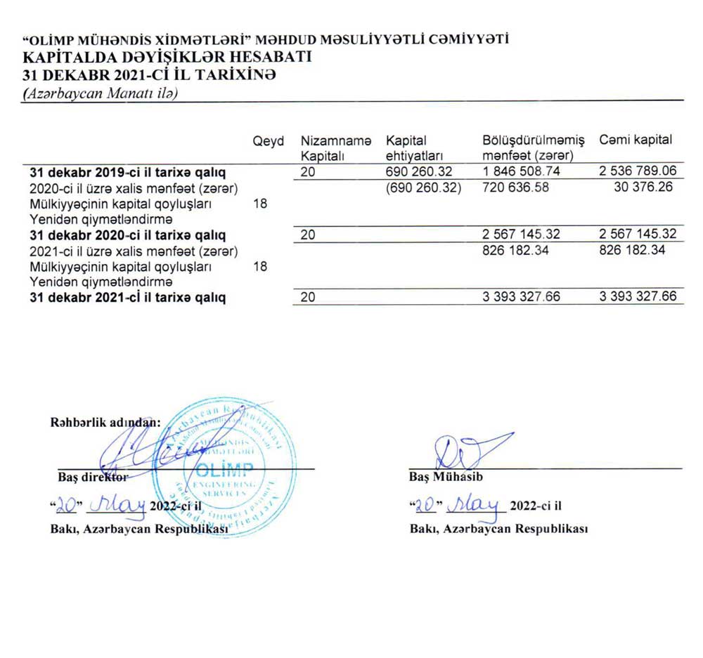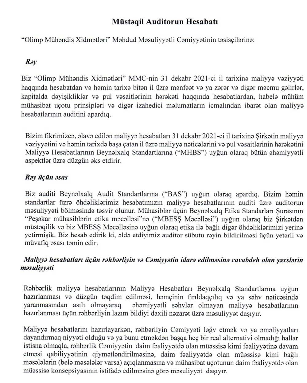 "Olimp Mühəndis Xidmətləri" MMC-nin 31 dekabr 2021-ci il tarixinə maliyyə hesabatları və müstəqil auditor rəyi.