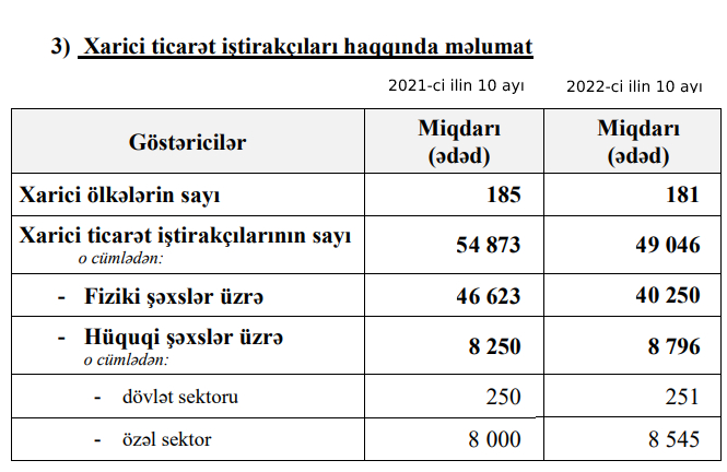 2021-ci ilin yanvar-oktyabr dövrü ilə müqayisədə 2022-ci ilin yanvar-oktyabr dövründə fiziki şəxs xarici ticarət iştirakçılarının sayı 6 min 373 şəxs azalaraq 40 min 250 şəxsə düşüb.
