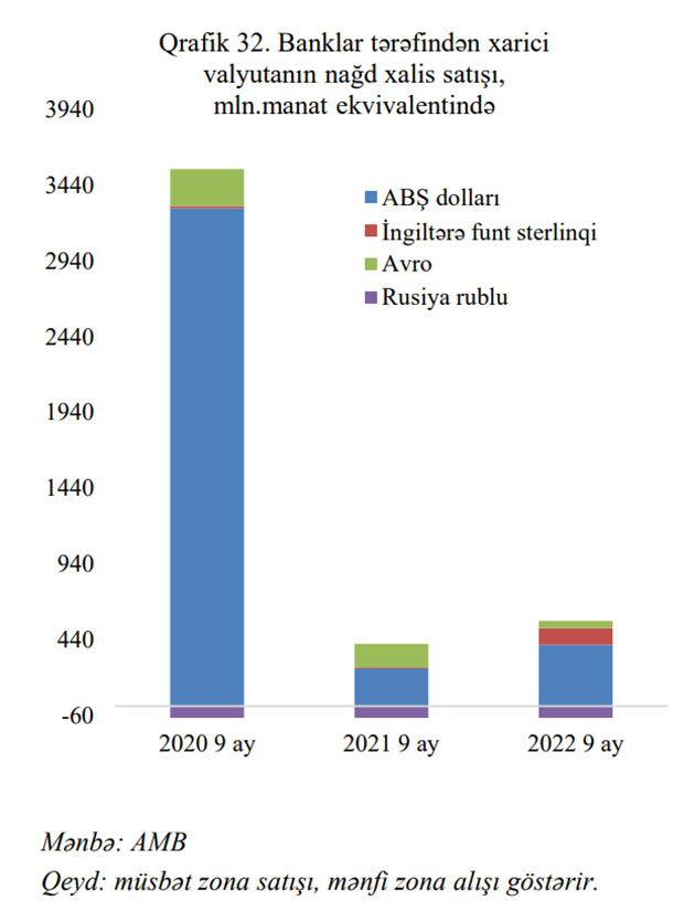 Banklar tərəfindən nağd xarici valyutanın alqı-satqısı üzrə aparılmış əməliyyatların həcmi ötən ilin müvafiq dövrünə nəzərən 46.9% artaraq 3.9 milyard ABŞ dolları ekvivalentində olmuşdur. Bunun 87.2%-ni ABŞ dolları ilə aparılmış əməliyyatlar təşkil etmişdir. 1-ci rübdə baş verən yüksək satışlar hesabına nağd xarici valyutanın xalis satışı 9 ayda ötən ilin müvafiq dövrünə nəzərən 48.1% artmışdır. Bununla belə, aprel ayından başlayaraq vəziyyət dəyişmiş və banklar tərəfindən xarici valyutanın alışı satışı üstələmişdir.