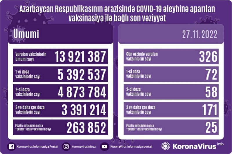 Azərbaycanda son sutkada koronavirus (COVID-19) əleyhinə 326 vaksin vurulub. Bir gündə birinci mərhələ üzrə vaksinasiya olunanların sayı 72, ikinci mərhələ üzrə vaksinasiya olunanların sayı 58, 3-cü və daha çox doza üzrə vaksinasiya olunanların sayı 171, pozitiv nəticədən sonra buster doza olunanların sayı isə 25 nəfərdir.