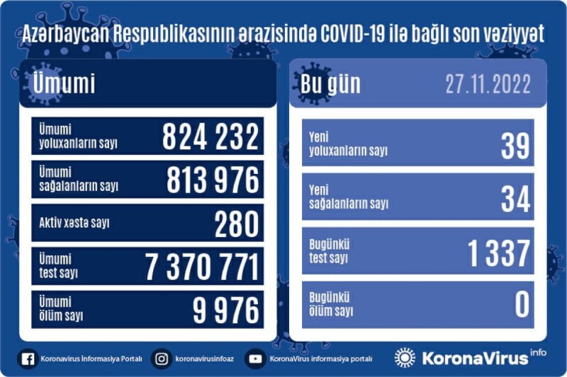 Azərbaycanda koronavirus (COVID-19) infeksiyasına 39 yeni yoluxma faktı qeydə alınıb, 34 nəfər müalicə olunaraq sağalıb.