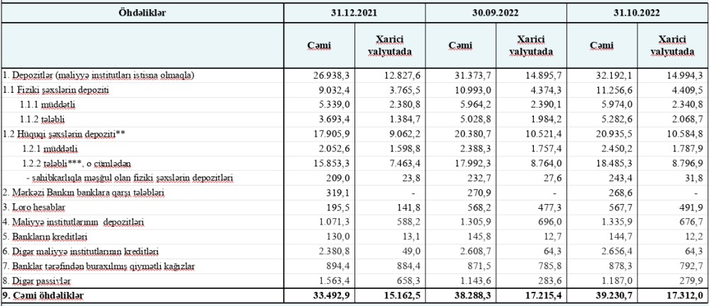 31 oktyabr 2022-ci il tarixinə olan bank sektorunun əsas göstəriciləri açıqlanıb.