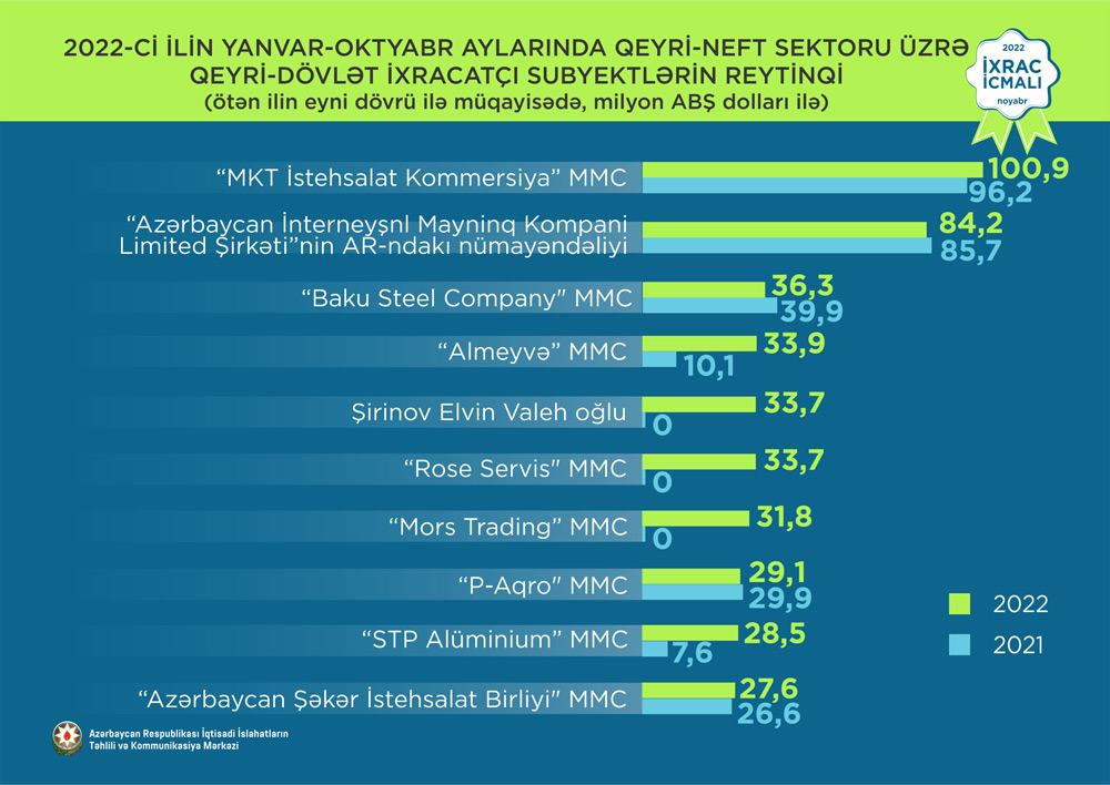 2022-ci ilin yanvar-oktyabr ayları üzrə hazırlanan qeyri-dövlət ixracatçı subyektlərin reytinqində ilk onluqda aşağıdakı şirkətlər təmsil olunurlar: