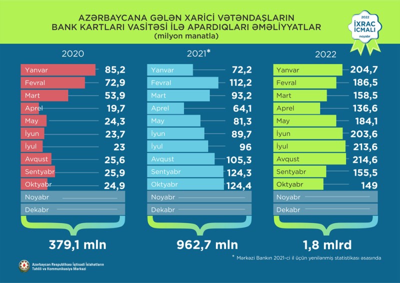 2022-ci ilin yanvar-sentyabr aylarında isə əcnəbilər bank kartları vasitəsi ilə 1,8 milyard manatlıq əməliyyat aparıblar.