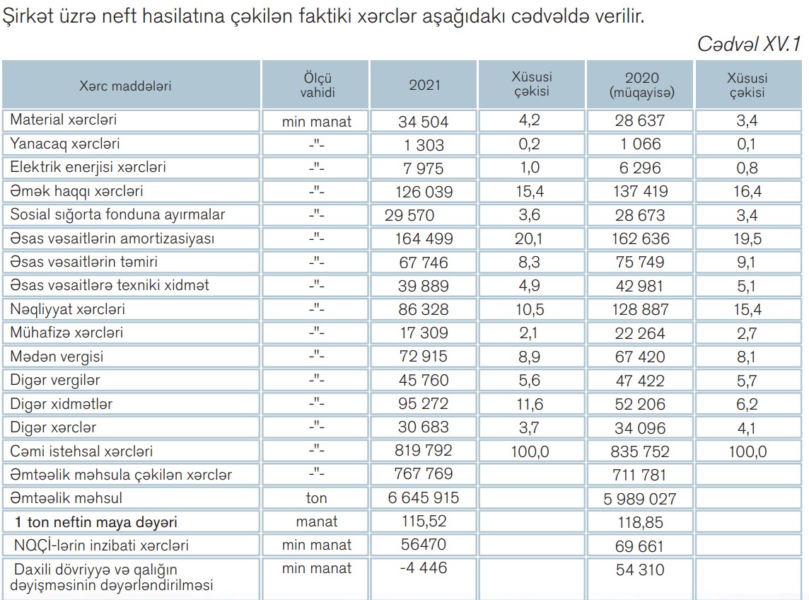 Marja.az SOCAR-a istinadən xəbər verir ki, 2021-ci ildə 1 ton neftin istehsal maya dəyəri 115,52 manat təşkil etmiş və keçən ilin müvafiq dövrü ilə müqayisədə 3,33 manat və ya 2,8 % azalmışdır. Şirkət üzrə neft hasilatına çəkilən faktiki xərclər aşağıdakı cədvəldə verilir