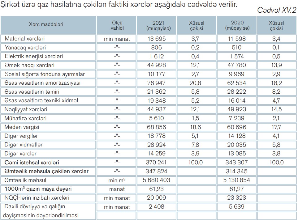 SOCAR üzrə qazın hasilatına çəkilən xərclərlə yanaşı, İstehsalat birliyinin digər xərcləri, qazın emalı, saxlanması, nəqli və “Azərkontrakt” ASC-dən alışına çəkilən xərclər nəzərə alınmaqla 2021-ci ildə SOCAR üzrə satılan 1000 m3 qazın faktiki xərci 121,9 manat təşkil etmişdir.