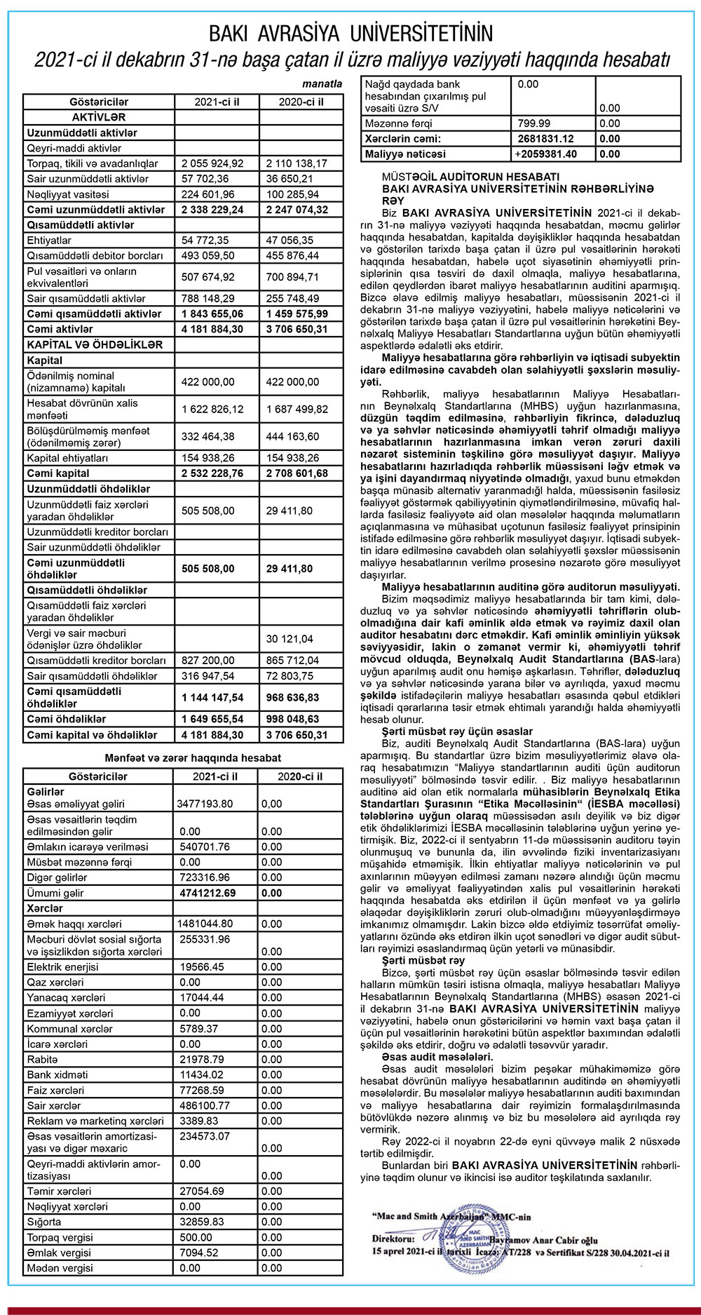 Bakı Avrasiya Universiteti 2021-ci ili 2 milyon 59 min manat mənfəət ilə başa vurub.