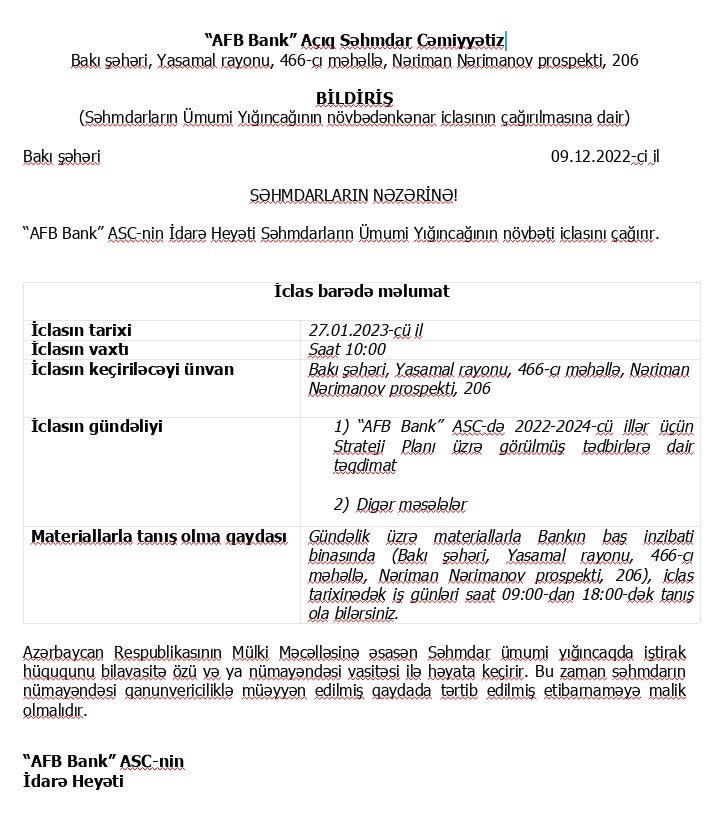 “AFB Bank” ASC səhmdarlarının Ümumi Yığıncağının növbədənkənar iclası çağırılıb.