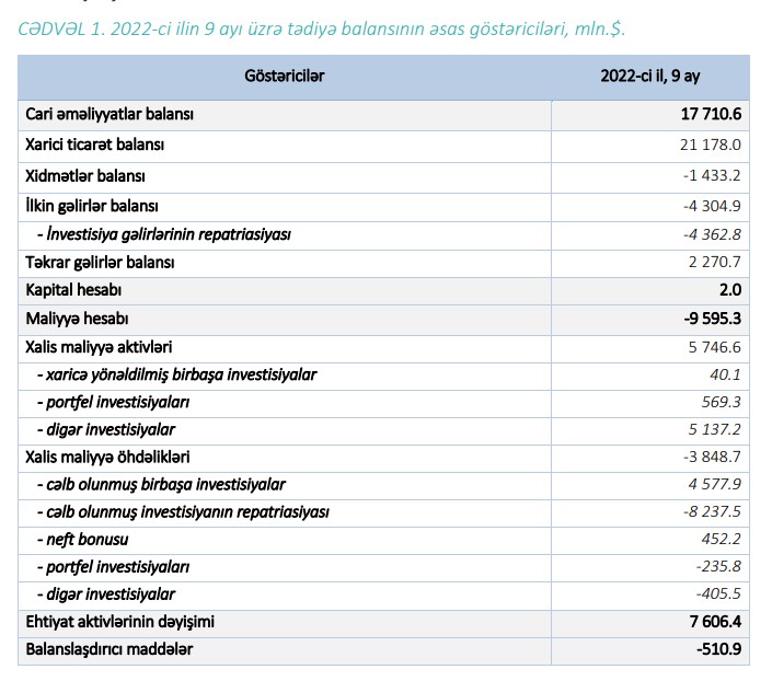Marja.az xəbər verir ki, bu, Mərkəzi Bankın 2022-ci ilin 9 ayı üzrə Tədiyə balansında bildirilir.