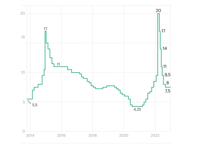 Mərkəzi bank oktyabr ayında faiz dərəcələrini müharibədən əvvəlki səviyyələrdən aşağı salmaq üçün altı addımda 12,5 faiz bəndi yumşalddıqdan sonra “neytral mövqe” qəbul edib. İstehlak qiymətlərinin kəskin aşağı düşməsindən ruhlanan ölkə fevralın sonlarında işğaldan sonra tətbiq edilən misli görünməmiş tədbirləri tez bir zamanda yumşaldır, çünki iqtisadiyyat ABŞ və müttəfiqlərinin sanksiyalarının təzyiqi altında böhrana düşür.