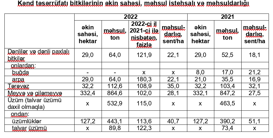 Şəhərdə 2022-ci lin məhsulu üçün 61,2 hektar sahədə əkin işləri aparılmış, ondan 29,0 hektarı payızlıq arpa, 32,2 hektarı tərəvəz bitkiləri təşkil etmişdir. Hazırda 2022-ci ilin məhsulu üçün kənd təsərrüfatı məhsullarının toplanışı başa çatmış, sahələrdən 64,0 ton arpa, 112,6 ton tərəvəz toplanmış, 2021-ci ilə nisbətən arpa istehsalı 11,5 ton, tərəvəz istehsalı 9,2 ton artmış, arpanın məhsuldarlığı 22,1 sentner/ha, tərəvəzin məhsuldarlığı 35,0 sentner/ha təşkil etmişdir.