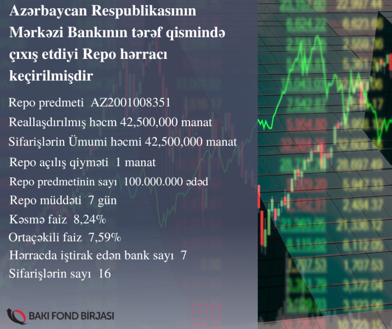 Birjanın yaydığı məlumata görə, 22 dekabr 2022-ci il tarixində Bakı Fond Birjasında Azərbaycan Respublikasının Mərkəzi Bankının tərəf qismində çıxış etdiyi Repo hərracı yekunlaşmışdır.