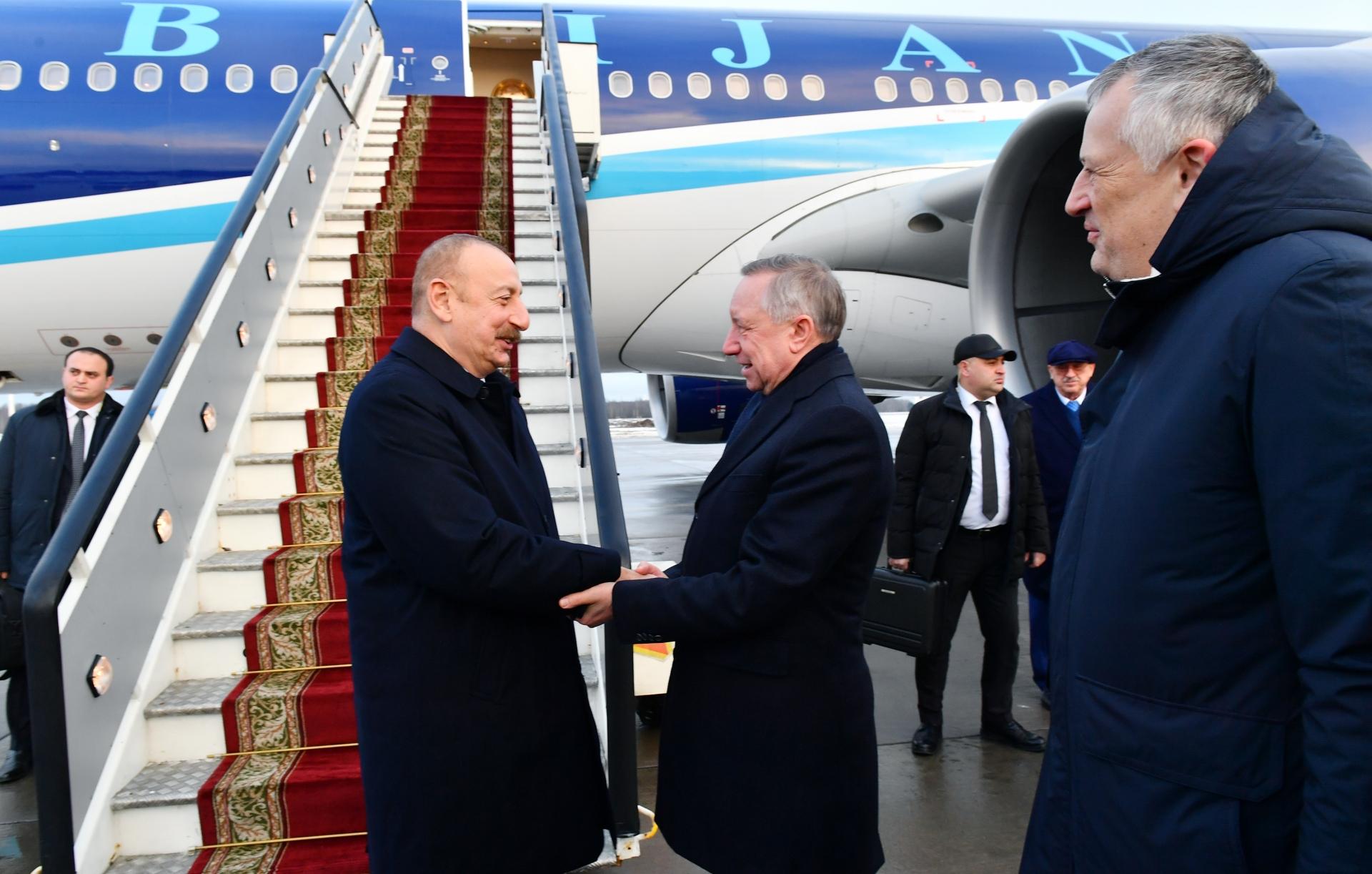 Sankt-Peterburq şəhərinin Pulkovo-2 hava limanında dövlət başçısını Sankt-Peterburq şəhərinin qubernatoru Aleksandr Beqlov, Leninqrad vilayətinin qubernatoru Aleksandr Drozdenko və digər rəsmi şəxslər qarşılayıblar.