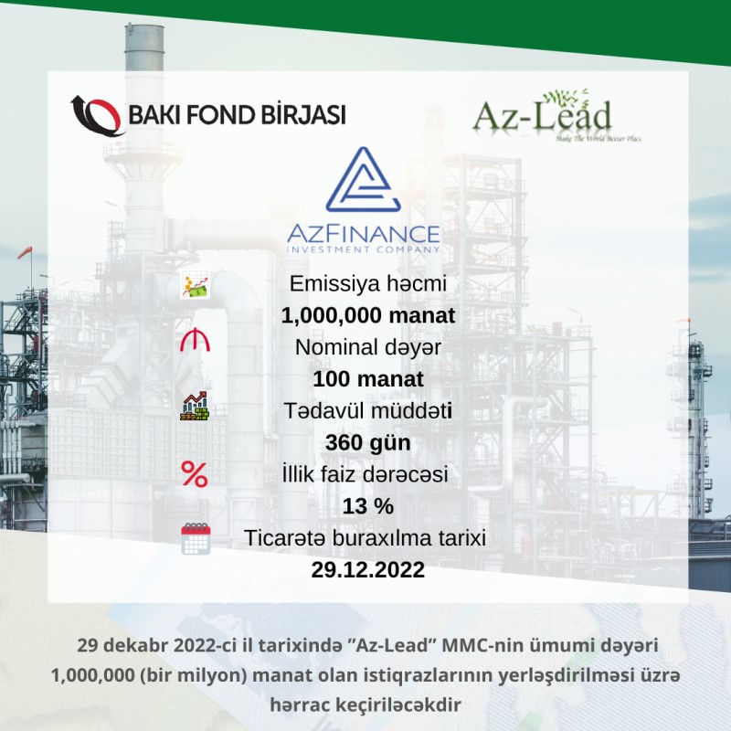 29 dekabr 2022-ci il tarixində ”Az-Lead” MMC-nin ümumi dəyəri 1 milyon manat olan istiqrazları yerləşdirilməsi birqiymətli hərrac üsulu ilə Bakı Fond Birjasında həyata keçiriləcəkdir.