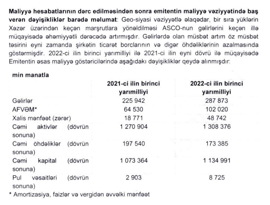 "Azərbaycan Xəzər Dəniz Gəmiçiliyi" QSC (ASCO) bu ilin 1-ci yarısını 48 milyon 742 min manat xalis mənfəət ilə başa vurub. Dövlətə məxsus şirkət 2021-ci ilin eyni dövrünü 18 milyon 771 min manat xalis mənfəət ilə bağlamışdı. Beləliklə, ASCO-nun xalis mənfəətində 2,6 dəfə artım qeydə alınıb.