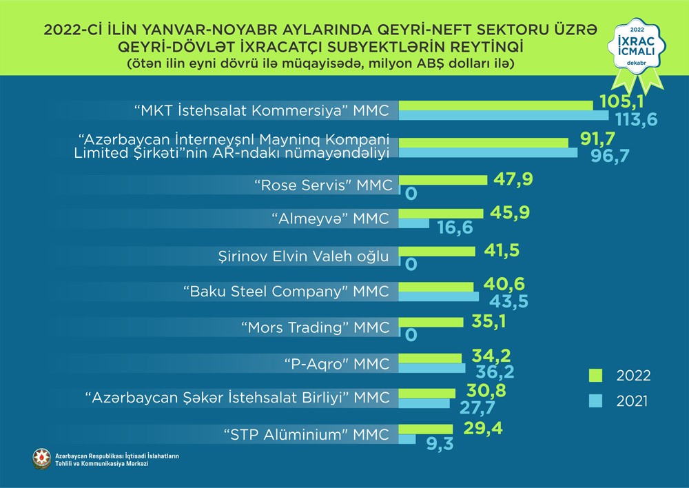 2022-ci ilin yanvar-noyabr ayları üzrə hazırlanan qeyri-dövlət ixracatçı subyektlərin reytinqində ilk onluqda aşağıdakı şirkətlər təmsil olunurlar: “MKT İstehsalat Kommersiya” MMC, “Azərbaycan İnterneyşnl Mayninq Kompani Limited Şirkəti”nin Azərbaycan Respublikasındakı Nümayəndəliyi, “Rose Servis” MMC, “Almeyvə” MMC, Şirinov Elvin Valeh oğlu, “Baku Steel Company” MMC, “Mors Trading” MMC, “P-Aqro” MMC, “Azərbaycan Şəkər İstehsalat Birliyi” MM, “STP Alüminium” MMC.