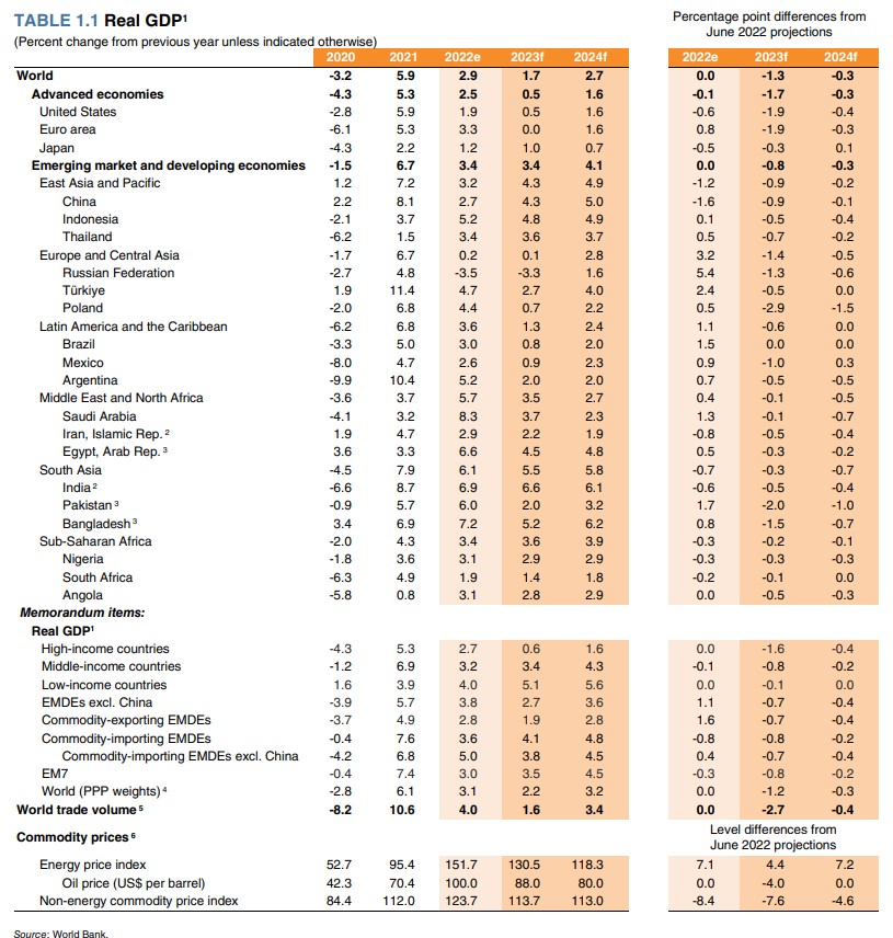 Dünya Bankı (DB) davamlı yüksək inflyasiya səbəbindən 2023-cü il üçün qlobal iqtisadi artım proqnozunu kəskin şəkildə aşağı salıb.Bildirilib ki, bu il qlobal ümumidaxili məhsul (ÜDM) 1.7% artacaq. Ötən ilin yayında açıqlanan hesabatda qlobal iqtisadi artım 3% proqnozlaşdırılmışdı.