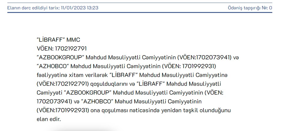 Marja.az xəbər verir ki, "LİBRAFF" MMC qoşulmalar nəticəsində yenidən təşkil olunduğunu elan edib.