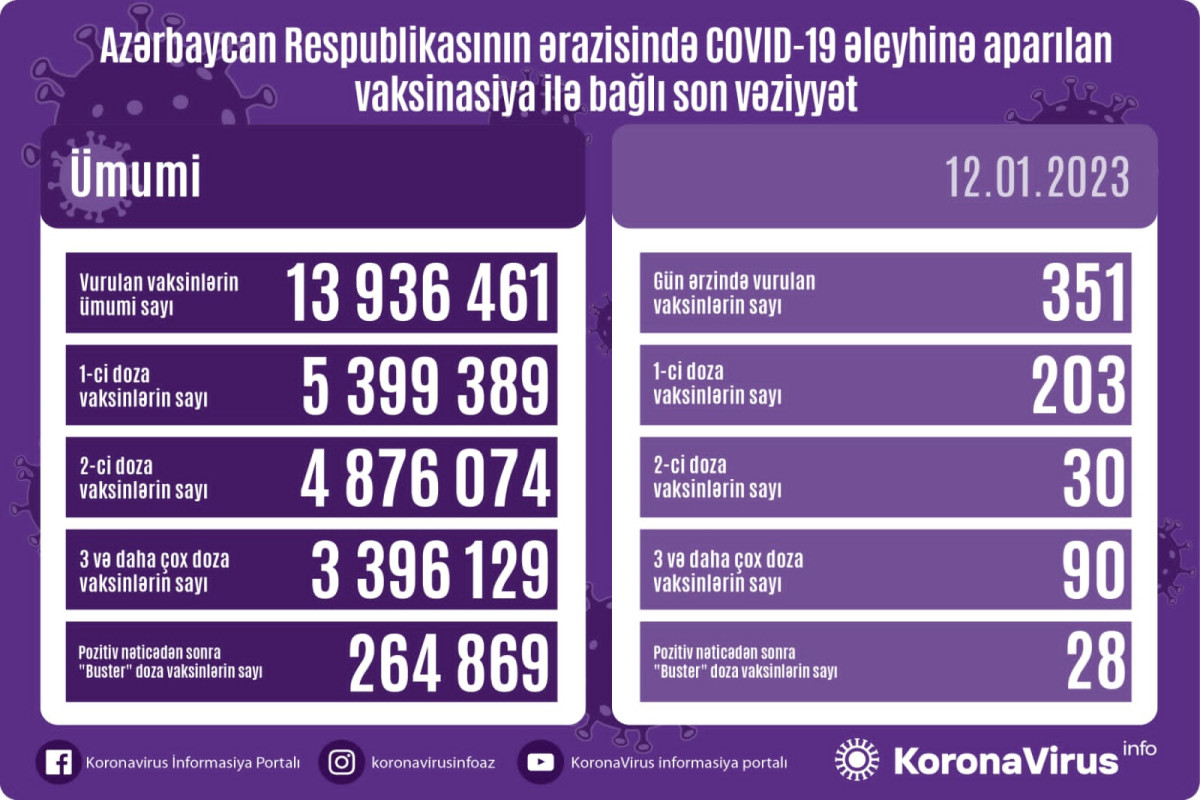 Azərbaycanda son sutkada koronavirus (COVID-19) əleyhinə 351 vaksin vurulub. Bir gündə birinci mərhələ üzrə vaksinasiya olunanların sayı 203, ikinci mərhələ üzrə vaksinasiya olunanların sayı 30, üç və daha çox doza üzrə vaksinasiya olunanların sayı 90, pozitiv nəticədən sonra buster doza üzrə vaksinasiya olunanların sayı 28 nəfərdir.
