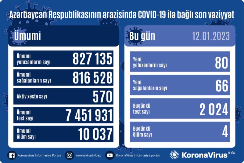 Azərbaycan Respublikasında koronavirus (COVID-19) infeksiyasına 80 yeni yoluxma faktı qeydə alınıb, 66 nəfər müalicə olunaraq sağalıb.