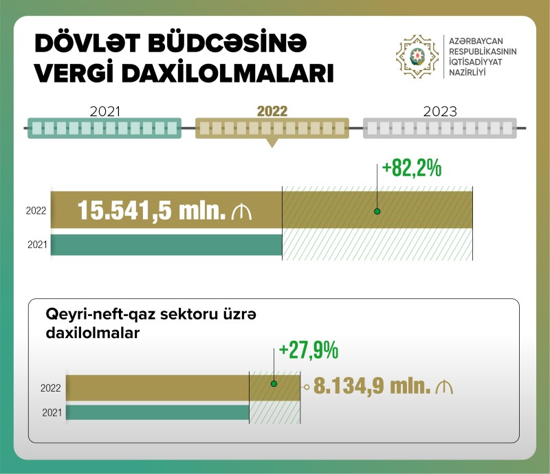 2022-ci ildə dövlət büdcəsinə vergi daxilolmaları 2021-ci illə müqayisədə 82,2% artaraq 15 milyard 541,5 milyon manat təşkil edib.