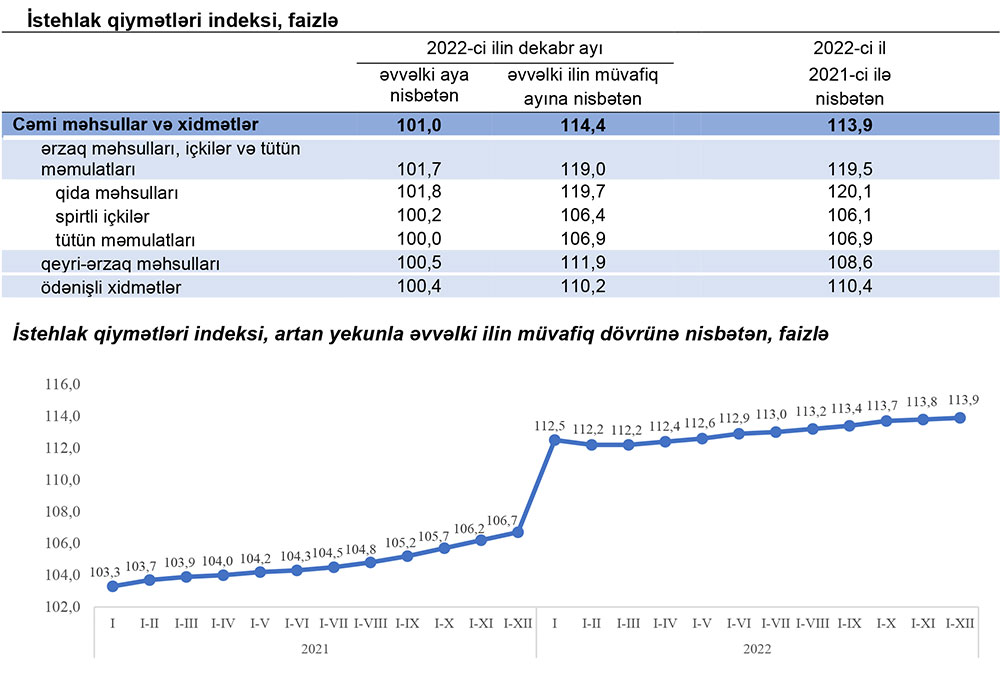 Dövlət Statistika Komitəsinin yaydığı məlumata görə, 2022-ci ilin dekabr ayında istehlak qiymətləri indeksi əvvəlki aya nisbətən 1 faiz, əvvəlki ilin dekabr ayına nisbətən 14,4 faiz yüksəlib.