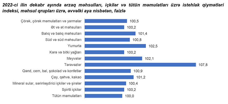 Ötən ilin dekabr ayında əvvəlki aya nisbətən ayrı-ayrı ərzaq məhsullarından daha çox bahalaşma manna yarmasının, düyünün, makaron məmulatlarının, peçenyenin, toyuq ətinin, təzə və dondurulmuş balığın, südün, pendirin, kəsmiyin, yumurtanın, qarğıdalı yağının, bananın, almanın, armudun, narın, qozun, fındığın, xiyarın, pomidorun, balqabağın, kartofun, soğanın, sarımsağın, yerkökünün, çuğundurun, şəkərin, konfetlərin, çayın, limonadın, meyvə şirəsinin, pivənin, ucuzlaşma isə əsasən portağalın, naringinin, limonun, xurmanın, kivinin, kələmin qiymətlərində müşahidə olunmuşdur. Digər ərzaq məhsullarının qiymətlərində ciddi dəyişikliklər baş verməmişdir.