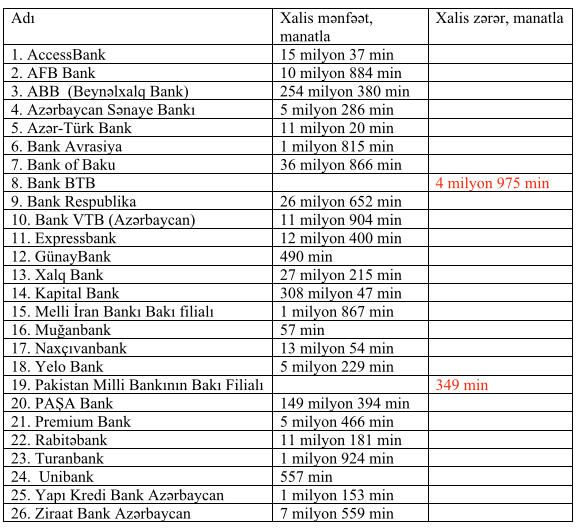 24 bank xalis mənfəət, 2 bank xalis zərər açıqladı - SİYAHI