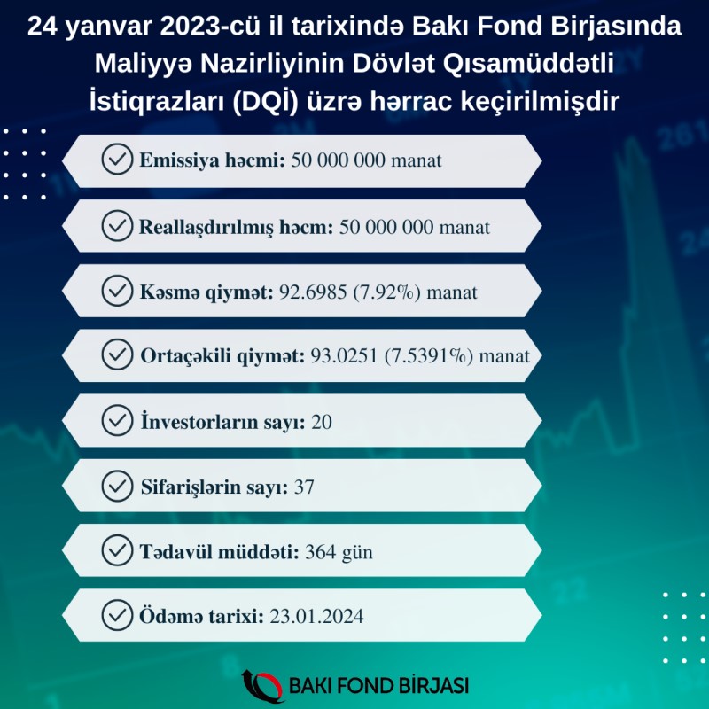 24 yanvar 2023-cü il tarixində Bakı Fond Birjasında Azərbaycan Respublikasının Maliyyə Nazirliyinin AZ0101030010 ISIN-li, 50 milyon manat həcmində, 364 gün tədavül müddətli dövlət qısamüddətli istiqrazlarının (DQİ) yerləşdirilməsi üzrə hərrac keçirilib.
