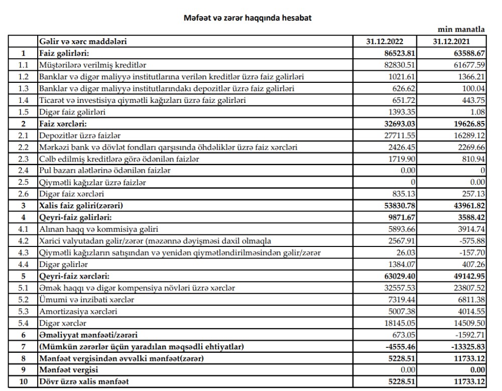 Press-relizdə qeyd edilib ki, hesabat dövrü üzrə Bankın faiz gəlirləri 86 mln manat olub. Bu isə 2021-ci il ilə müqayisədə 23 mln manat daha çoxdur. Qeyd edək ki, Bank ili