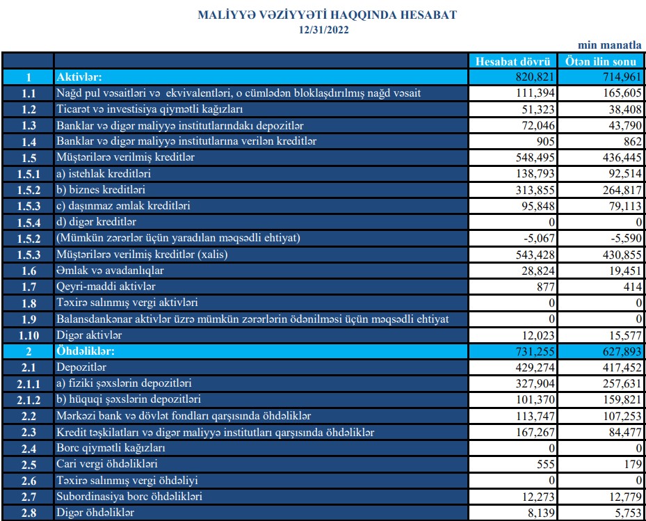 "Turanbank" ASC 2022-ci il üzrə maliyyə göstəricilərini açıqlayıb.