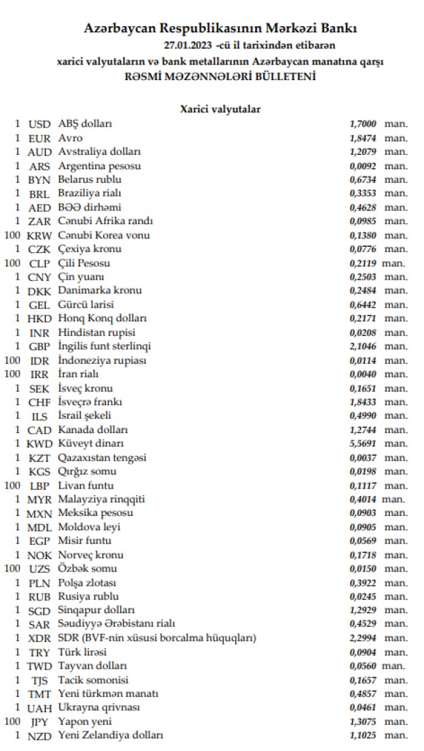 Dolların bazar ertəsi üçün rəsmi məzənnəsi müəyyən olunub