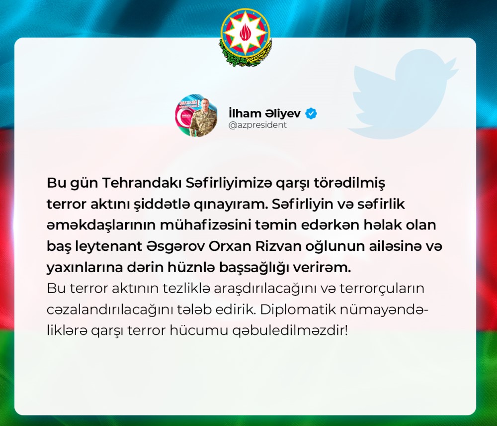 "Bu gün Tehrandakı səfirliyimizə qarşı törədilmiş terror aktını şiddətlə qınayıram. Səfirliyin və səfirlik əməkdaşlarının mühafizəsini təmin edərkən həlak olan baş leytenant Əsgərov Orxan Rizvan oğlunun ailəsinə və yaxınlarına dərin hüznlə başsağlığı veriram.
