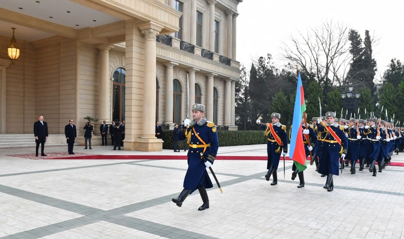 Hər iki ölkənin Dövlət bayraqlarının dalğalandığı meydanda Misir Prezidentinin şərəfinə fəxri qarovul dəstəsi düzülüb.
