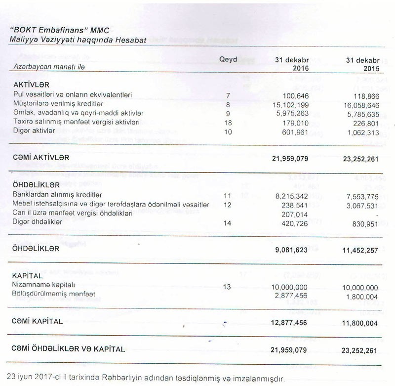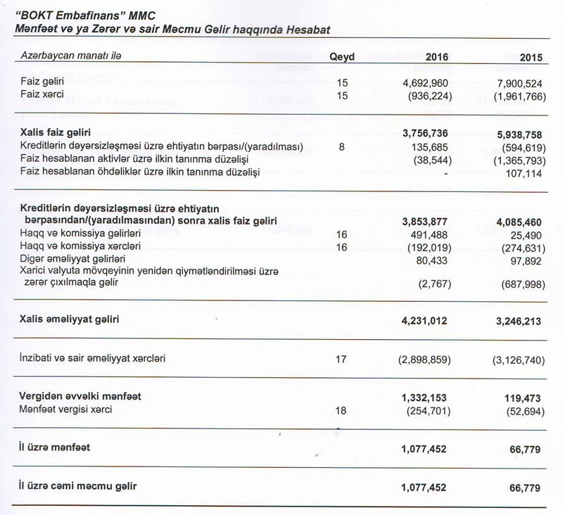 “Marja” BOKT-ın 2016-cı il üzrə maliyyə hesabatlarına istinadən xəbər verir ki, 2015-ci illə müqayisədə “Embafinans”ın xalis mənfəəti 16 dəfə artıb. “BOKT EmbaFinans” MMC 2015-cı ili 66 min 779 manat xalis mənfəət ilə başa vurmuşdu.