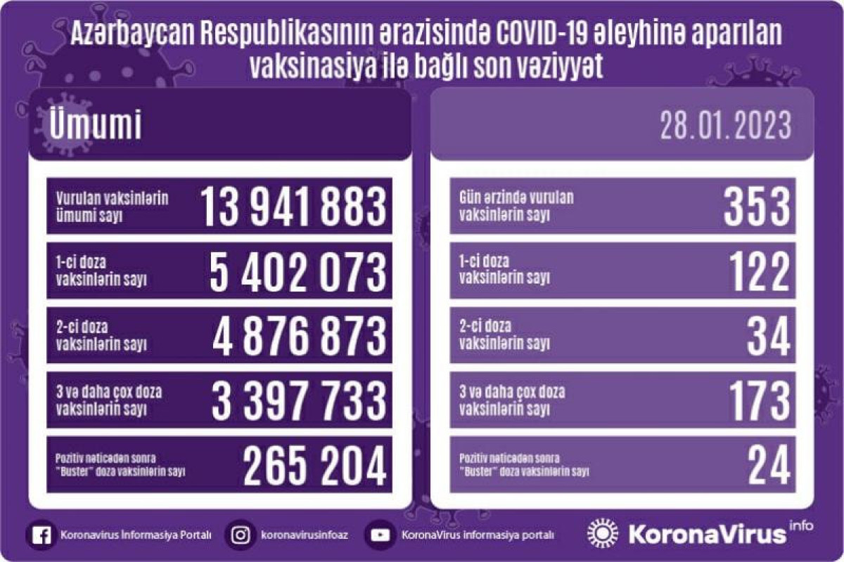 Azərbaycanda son sutkada koronavirus (COVID-19) əleyhinə 353 vaksin vurulub. Bir gündə birinci mərhələ üzrə vaksinasiya olunanların sayı 122, ikinci mərhələ üzrə vaksinasiya olunanların sayı 34, üç və daha çox doza üzrə vaksinasiya olunanların sayı 173, pozitiv nəticədən sonra “Buster doza” vaksin olunanların sayı isə 24-dür.