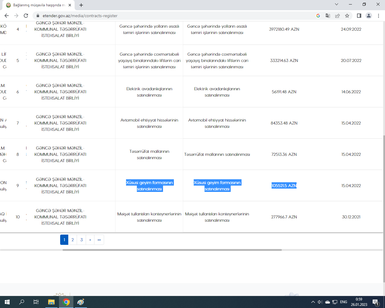 Tender məlumatlarına baxdıqda məlum olur ki, işçilərin xüsusi geyimlərlə təminatı ilə bağlı Gəncə MKTİB 2020-ci ildən bu günə qədər 3 dəfə - 31.12.2020, 31.03.2022, 31.12.2022 tarixlərində - tender keçirdib. İki tenderdə “LK Machinery” MMC, bir tenderdə isə “Abşeron Tekstil” MMC qalib olublar.