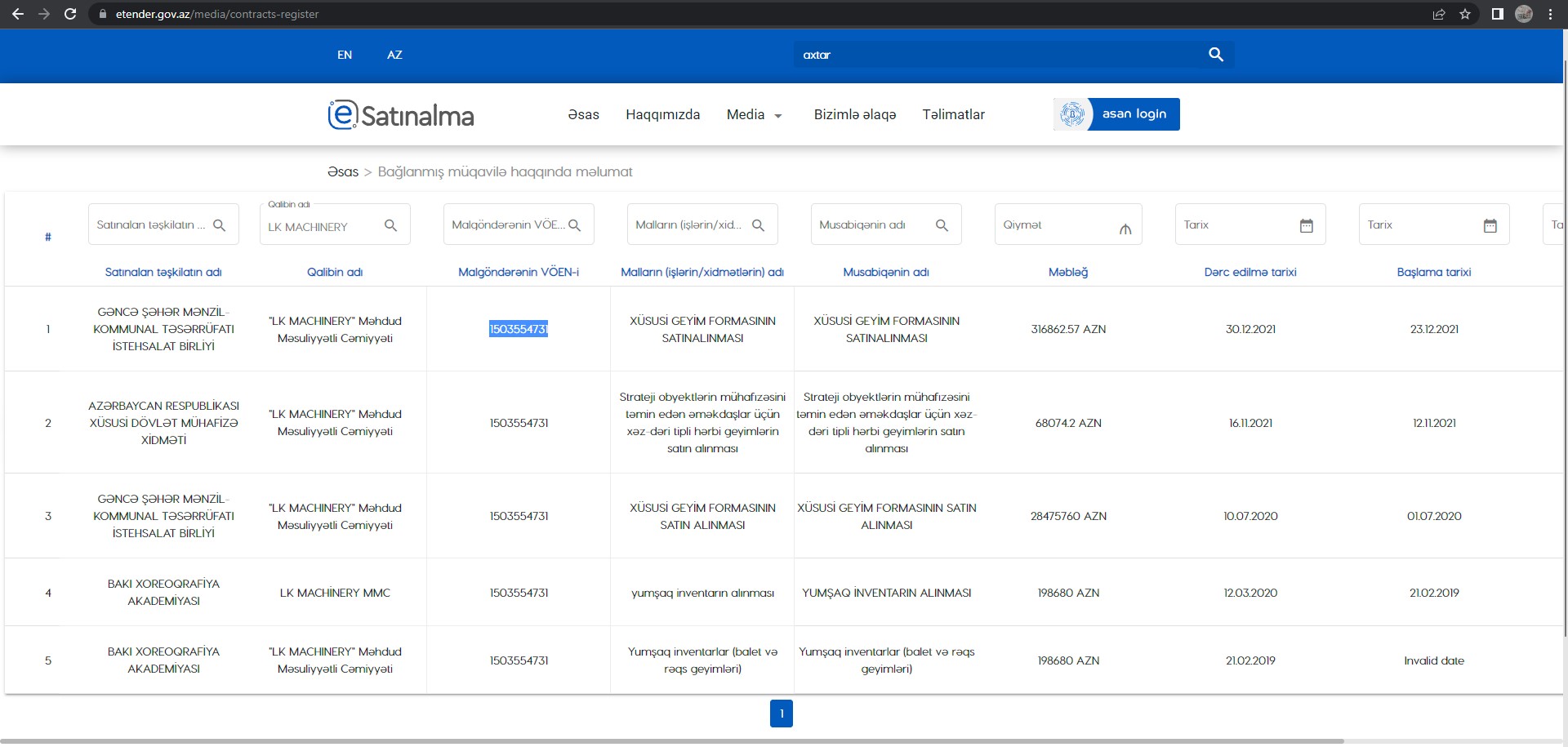 Orxan İsmayılov Marja.az-a bildirib ki, araşdırması zamanı, tenderlərdə qalib elan edilən “LK Machinery” MMC üçün göstərilən VÖEN-in (1503554731) əslində "Abşeron Tekstil” MMC-yə məxsus olduğunu aşkar edib.