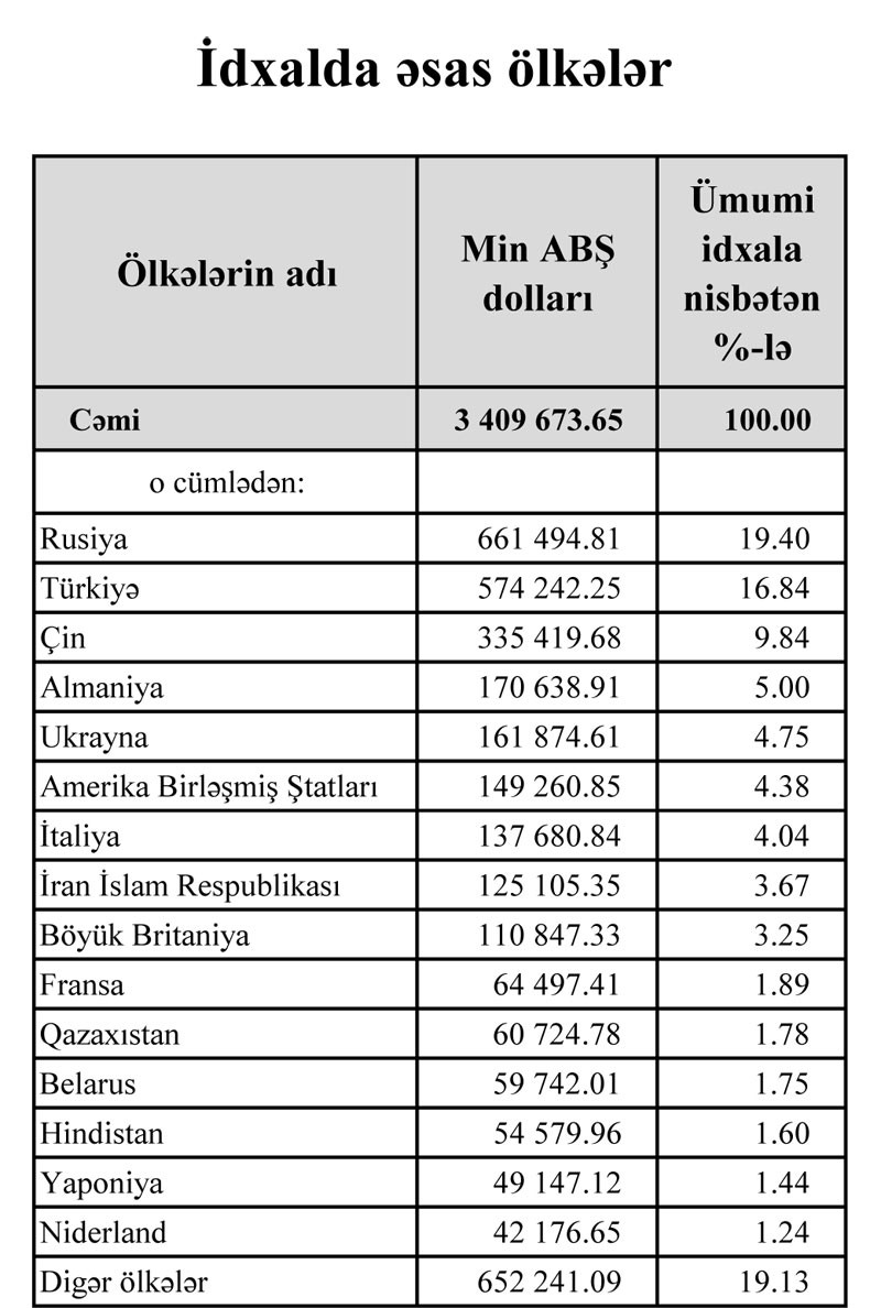 “Marja” Dövlət Gömrük Komitəsinin statistikasına istinadən xəbər verir ki, Azərbaycan ən çox malları Rusiya (661,5 milyon dollar), Türkiyə (574,2 milyon dollar) və Çindən (335,4 milyon dollar) idxal edib.