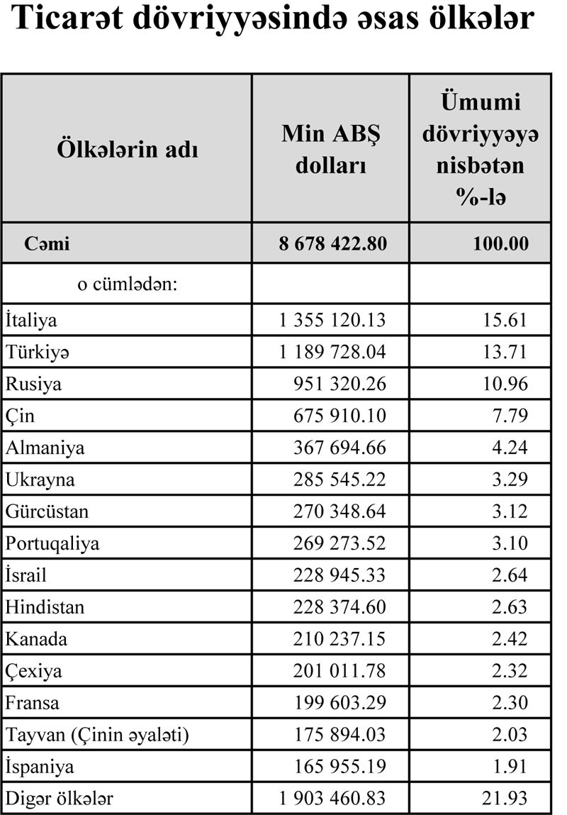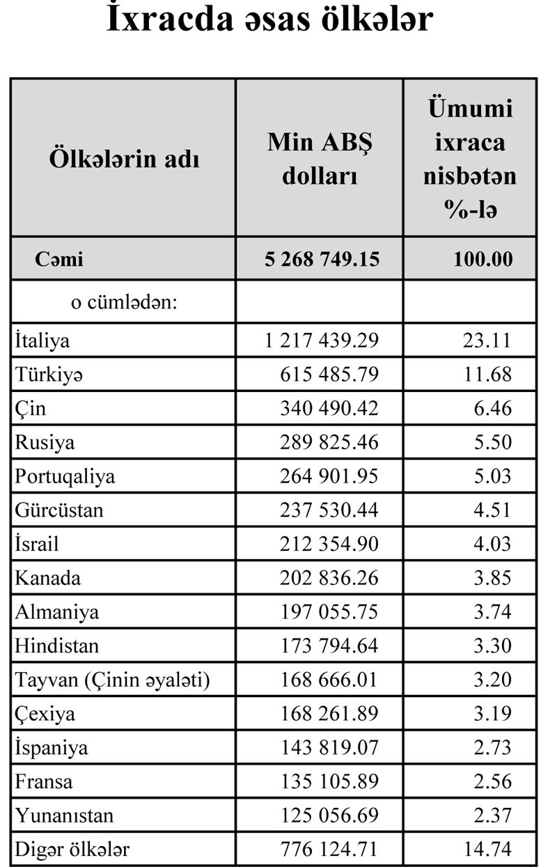 Azərbaycanın ən çox mal ixrac etdiyi ölkələr isə İtaliya (1,2 milyard dollar), Türkiyə (615,5 milyon dollar), Çin (340,5 milyon dollar) və Rusiyadır (289,8 milyon dollar). Azərbaycanın ixracı əsasən neft və qaz ilə bağlıdır.