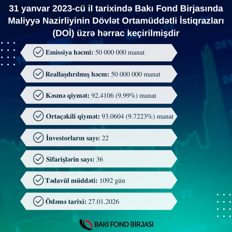 31 yanvar 2023-cü il tarixində Bakı Fond Birjasında Azərbaycan Respublikası Maliyyə Nazirliyinin AZ0201040026 ISIN-li, 50 milyon manat həcmində, 1092 gün olan tədavül müddətli dövlət ortamüddətli istiqrazlarının (DOİ) yerləşdirilməsi üzrə hərrac keçirilib.