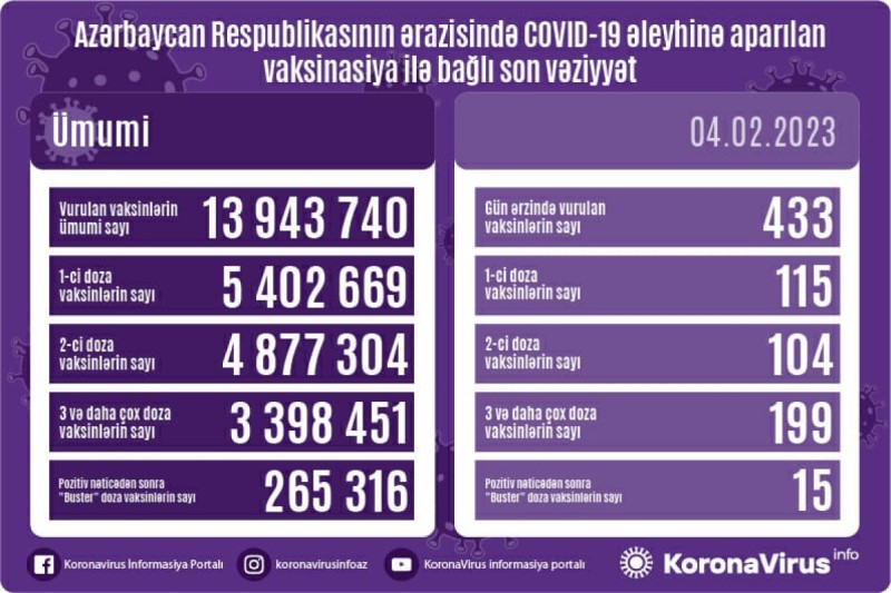 Azərbaycanda son sutkada koronavirus (COVID-19) əleyhinə 433 vaksin vurulub. Bir gündə birinci mərhələ üzrə vaksinasiya olunanların sayı 115 , ikinci mərhələ üzrə vaksinasiya olunanların sayı 104, üç və daha çox doza üzrə vaksinasiya olunanların sayı 199, pozitiv nəticədən sonra buster doza üzrə vaksinasiya olunanların sayı 15 nəfərdir.