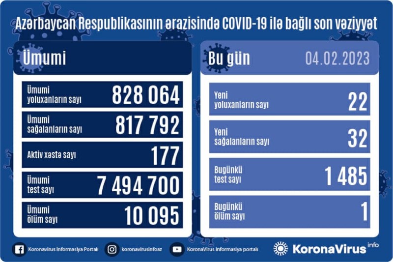 Azərbaycan Respublikasında koronavirus (COVID-19) infeksiyasına 22 yeni yoluxma faktı qeydə alınıb, 32 nəfər müalicə olunaraq sağalıb.