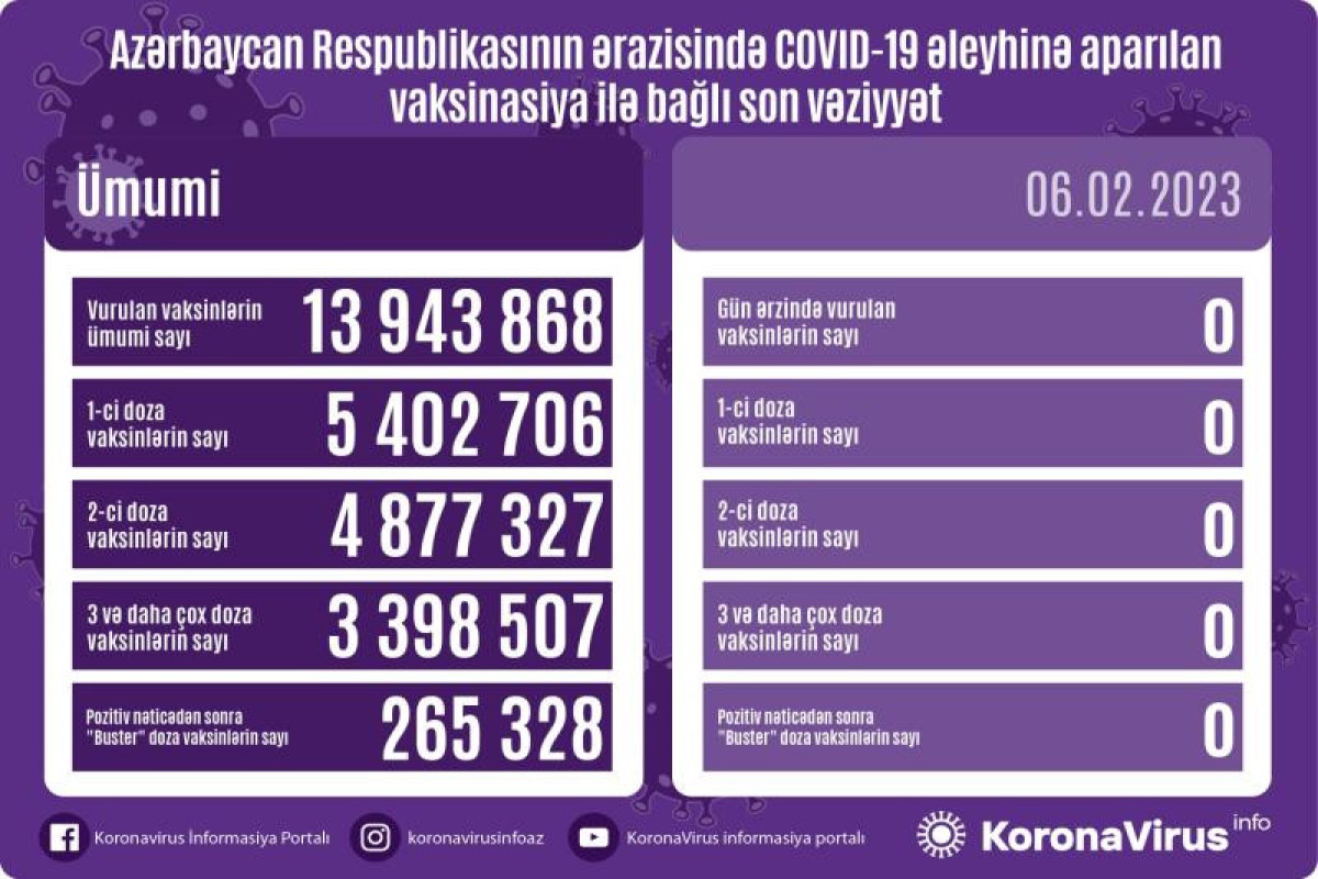 Vurulan vaksinlərin ümumi sayı 13 943 868, birinci mərhələ üzrə vaksinasiya olunanların ümumi sayı 5 402 706, ikinci mərhələ üzrə vaksinasiya olunanların sayı 4 877 327, üç və daha çox doza üzrə vaksinasiya olunanların sayı 3 398 507, pozitiv nəticədən sonra buster doza üzrə vaksinasiya olunanların sayı isə 265 328 nəfər təşkil edir.