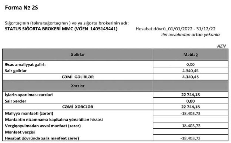 "Status Sığorta Brokeri" MMC 2022-ci ili 18 min 404 manat xalis zərər ilə başa vurub. Şirkət 2021-ci ili 21 min 399 manat xalis zərər ilə bağlamışdı.