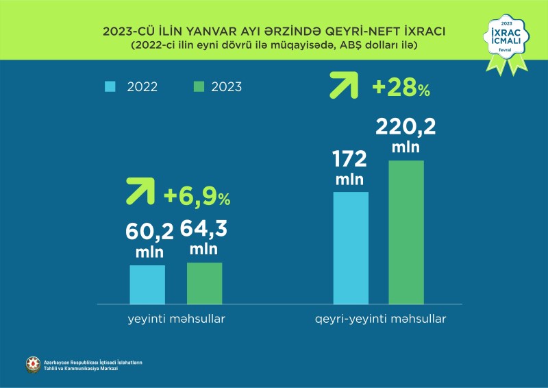 İqtisadi İslahatların Təhlili və Kommunikasiya Mərkəzinin yaydığı məlumata görə, qeyri-neft sektoru üzrə ixrac 2022-ci ilin müvafiq dövrü ilə müqayisədə 22,6% artıb. 2023-cü ilin yanvar ayı ərzində yeyinti məhsulları üzrə ixrac 64,3 milyon ABŞ dolları, qeyri-yeyinti məhsulları üzrə isə 220,2 milyon ABŞ dollarına bərabər olub.