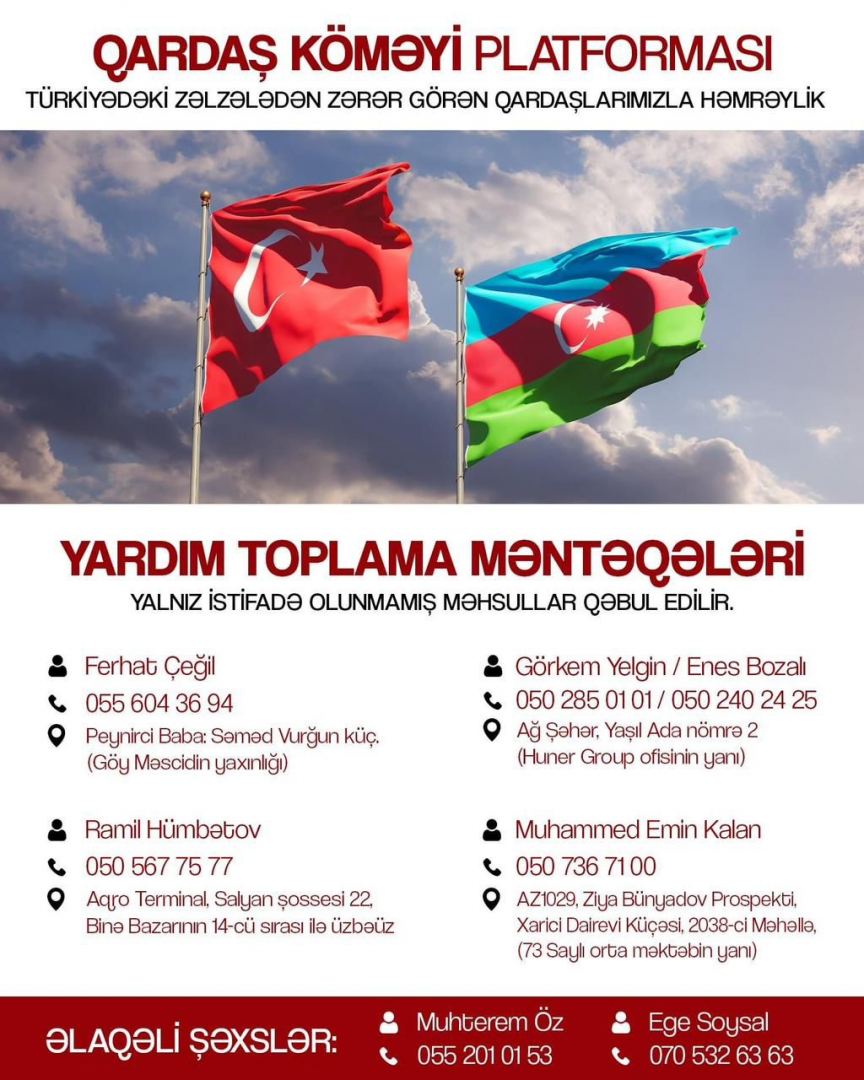MÜSİAD Azərbaycan, ATİB, TUİB, Azərbaycan Sahibkarlar Konfederasiyası, Türkiyə Universitetləri Məzunları İctimai Birliyi, Azərbaycan Əczaçılar Klubu, Gəncliyə Yardım Fondu, Müasir İnkişaf Birliyi, KOBSKA, Türkiyə Məzunu Ziyalılar və İş Adamları Platformu, Tərxis Olunmuş Hərbçilərin Gəncləri Maarifləndirmə Birliyi və KOBİA təmsilçisinin də iştirakı ilə təsis edilən "Qardaş Köməyi" platforması Türkiyəyə zəlzələ bölgəsinə göndəriləcək malların adlarını açıqlayıb.