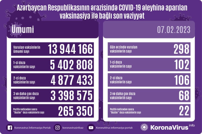 Azərbaycanda son sutkada koronavirus (COVID-19) əleyhinə 298 vaksin vurulub. Bir gündə birinci mərhələ üzrə vaksinasiya olunanların sayı 102, ikinci mərhələ üzrə vaksinasiya olunanların sayı 106, üç və daha çox doza vaksin vurduranların sayı 68, pozitiv nəticədən sonra buster doza üzrə vaksinasiya olunanların sayı isə 22 nəfərdir.